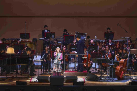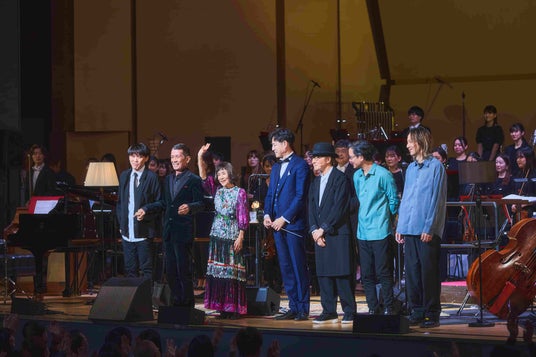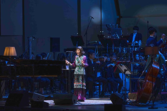 「グランプリ」の高揚感を受け継いで、ライヴはどんどん楽しさを増していく。大貫が「いちばん楽しい曲です」と語った「ふたりの星をさがそう」は、曲をアレンジした網守将平が今回のオーケストラ・アレンジも手がけたそうで、大貫は楽しそうに体を揺らしながら歌う。そして、ミラーボールが輝くなかで歌う「Shall We Dance?」の幸福感。「Shall We Dance?」は同名映画の主題歌だが、スラリとした指揮者の佐々木と大貫が、映画の主人公の役所広司と草刈民代のようにも見えた。歌い終わったあと、「この前、テレビをつけたとたん、〈Shall We Dance?~〉って曲が流れてきてびっくりしました」と大貫は愉快そうに微笑んだ。そして、ラスト・ナンバーは坂本龍一の曲に大貫が歌詞をつけた「3びきのくま」。「果てない宇宙で 今日も夢を見た」という歌い出しの一節を聴いた瞬間に心が宇宙に飛ぶ。祈りに似たような歌を、オーケストラが音の銀河となって包み込むような感動のエンディングだ。