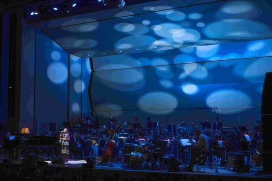 ステージの幕が開くとオーケストラがインスト曲「カイエ」を演奏。7月の「ピーターと仲間たち」もこの曲で始まったが、今回はオリジナル曲のストリングスの美しさが何倍にも魅力を増して輝いている。さらに木管楽器も加わって、ステージ一面に花が咲いたような色彩豊かな演奏だ。そんななか、華やかなドレスに身を包んだ大貫妙子が登場。照明に手をかざしながら観客席を見渡して、「こんばんは。今日はゆっくりお楽しみください」と観客に笑顔で挨拶。「Tema Purissima」を歌う。バンドとオーケストラの共演がなんとも贅沢だ。続く「夏に恋する女たち」では波打つようなストリングスの調べに大貫の歌声が浮遊する。