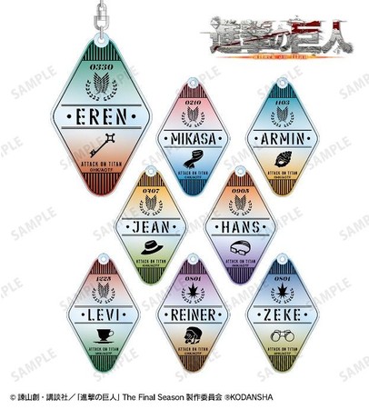エレン、ミカサ、アルミン、ジャン、ハンジ、リヴァイ、ライナー、ジークの名前と、それぞれをイメージしたモチーフなどと合わせたデザインに仕上げました。