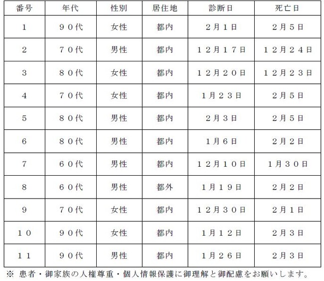 都内で新型コロナウイルスに感染した方が死亡されましたのでお知らせします。