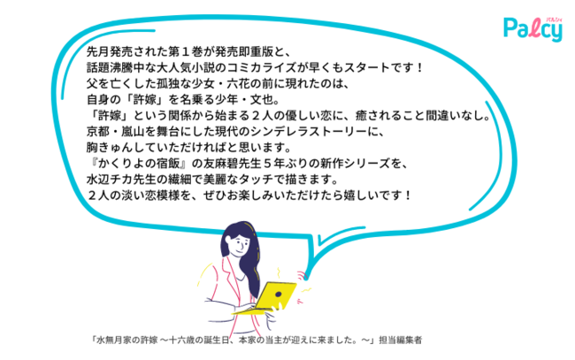 『水無月家の許嫁 ~十六歳の誕生日、本家の当主が迎えに来ました。~』は少女・女性マンガアプリPalcy(パルシィ)にて2022年4月17日(日)より毎週日曜日更新で連載配信をスタートします。