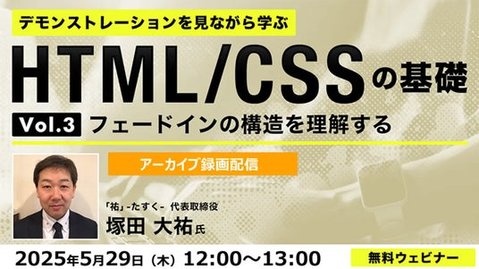 株式会社クリーク・アンド・リバー社(C&R社)は5月29日(木)、2024年11月に開催したオンラインセミナー「デモンストレーションを見ながら学ぶ HTML/CSSの基礎(3)~フェードインの構造を理解する~」のアーカイブ映像を無料配信します。