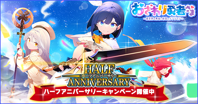シグルーンとの特別な1日が堪能できるボイスコンテンツ「おしゃべり勇者さま」が貰える「ハーフアニバーサリー直前ログインボーナス」を始め、「1日1回毎日無料10連召喚キャンペーン」や経験値アイテムが毎日もらえる「育成応援ログインボーナス」、スターストーンが沢山もらえる「ハーフアニバーサリーログインボーナス」を実施中!