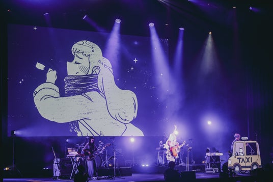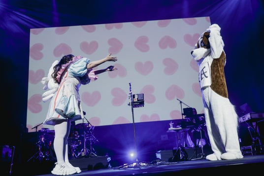 れ子ちゃんが旅の最初に見つけたのは“らぶ”。ここから「あたしが死んでも」など愛について描いた楽曲を披露していく。「みんな、こんばんはー! 今日は、私についてくる準備できてる? 一緒に旅をしましょう。レッツゴー!」という一言から、ライブ定番曲「あたしを彼女にしたいなら」へ。ひぐちけい(Gt)のキレのあるギタープレイが盛り上げる中、コレサワが観客を煽り、クラップや合いの手で会場の一体感を高めていく。SNSで流行中の「元彼女のみなさまへ」では、スクリーンにカラオケ風の歌詞つき映像が流れ、大合唱が起こった。