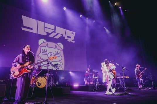 今回は、コレサワのキャラクター“れ子ちゃん”の秘密に迫るストーリー。定刻になるとブザーが鳴り、映画さながらに開演前の注意事項が流れる。そして、アートワークを手掛けるウチボリシンペが描き下ろしたアニメーションを上映。れ子ちゃんの体にはぽっかり穴が空いており、周囲から「変なの」「気持ち悪い」など心ない言葉を投げかけられてしまう。傷ついたれ子ちゃんは、穴を埋める方法を探す旅に出る――「君も一緒に来る?」というナレーションから、「シュシュ」でライブがスタート。コレサワはれ子ちゃんと同じうさぎのぬいぐるみを背負い、U(Dr)のドラムに合わせて足踏みをする。そんなコレサワとれ子ちゃんの姿、旅について描いた「シュシュ」の歌詞がリンクし、高揚感と切なさをかき立てる。