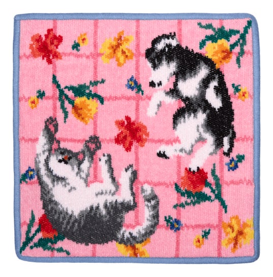 春の花々に包まれた犬と猫の幸せなひとときを、フェイラーならではの繊細なシュニール織で丁寧に表現しました。
