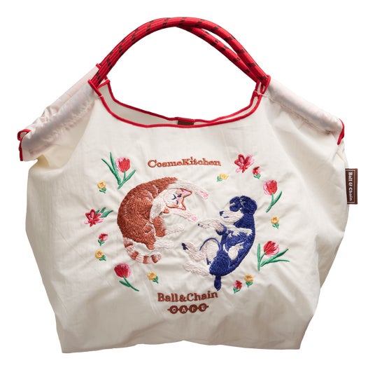 暖かな陽が差し込む花畑で寄り添いながら眠る犬と猫。見ているだけで心が温まる幸せなひとときを、<FEILER(フェイラー)>のシュニール織ハンカチと<Ball&Chain(ボールアンドチェーン)>の刺繍バッグ&ポーチに宿らせたコスメキッチンが贈る春のコレクション