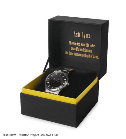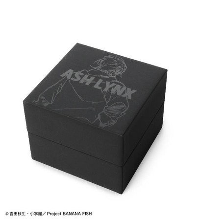 BOX表面にはアッシュの名前と後ろ姿をレイアウトし、蓋の内側にはアッシュの名前に加えて、時計本体の裏ぶたと同様に作中の英二の台詞を英訳してゴールドの箔プリントで施しています。