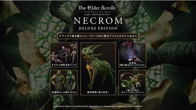 権利表記 :Published by EXNOA LLC (c)2023 ZeniMax Media Inc. The Elder Scrolls(R)Online: Necrom(TM) developed by ZeniMax Online Studios LLC, a ZeniMax Media company. ZeniMax, The Elder Scrolls, Necrom, ESO, ESO Plus, Bethesda, Bethesda Softworks and related logos are registered trademarks or trademarks of ZeniMax Media Inc. in the US and/or other countries. All Rights Reserved.