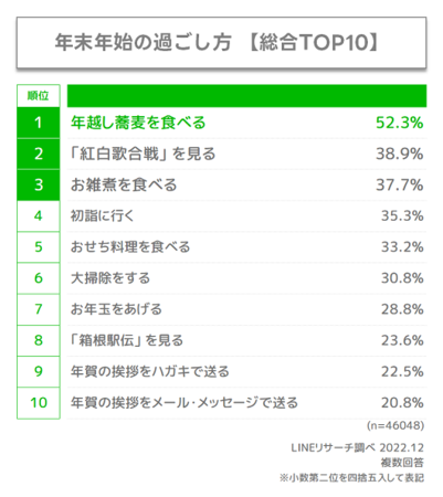 このたびLINEリサーチでは、日本全国の男女を対象に、年末年始の過ごし方や、2022年流行ったと思うヒト、モノ、コトなどについて調査しましたので、その結果をお知らせいたします。