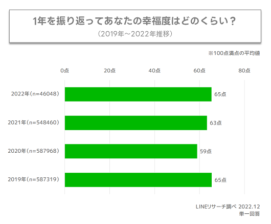 ■2022年を振り返った幸福度は、新型コロナウイルス感染拡大前のスコアに戻り65点