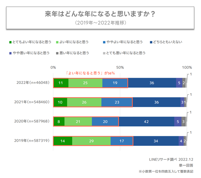2023年はどんな年になると思うか聞いてみました。昨年に比べ【よい年になると思う】(「とてもよい年になると思う」「よい年になると思う」「ややよい年になると思う」の合計)と回答した人は56%となり、昨年よりもわずかに下回る結果となりました。