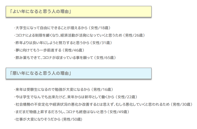 次に「よい年になると思う」、「悪い年になると思う」のそれぞれの理由についていくつかご紹介していきます。
