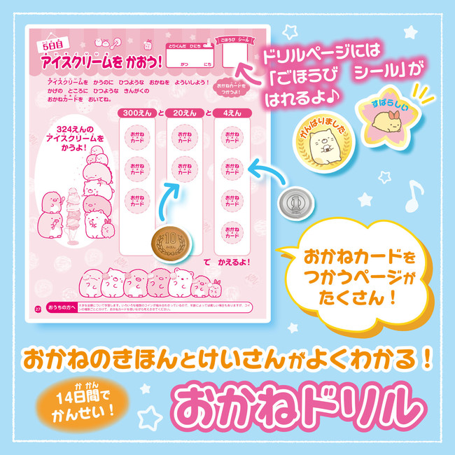 本誌の「おかねドリル」は、1日1ページ、14日間でお金の基本と計算がよくわかるようになる学習ページです。おかねカードを使って考える問題もたくさん。お子さまのやる気がアップする「ごほうび シール」を貼るスペースもあります。