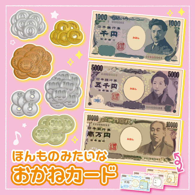 まだまだ豪華付録が大充実! 「おかねカード」は、まるで本物のようなコイン(1円玉・5円玉・10円玉・50円玉・100円玉・500円玉)とお札(1000円札・5000円札・10000円札)の絵柄です。