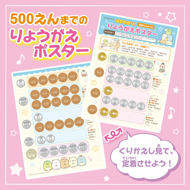 「りょうがえポスター」は、500円までのコインの両替を一覧表にしたポスターです。繰り返し見るうちに、お子さまがつまずきやすい両替の問題も解きやすくなっていきます。