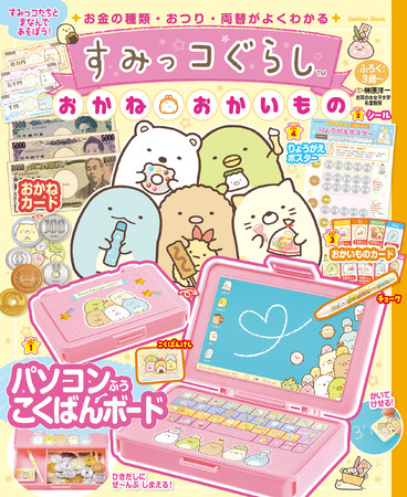 大人気「すみっコぐらし」のかわいいキャラクターたちと一緒に、お金の種類や両替、おつりなど、お金の基本について学べる付録つきムックです(監修・榊原洋一<お茶の水女子大学名誉教授>)。めいろやすごろくなどを通して、すみっコたちと遊びながら楽しくお勉強ができます。付録は、学習にも遊びにも使える「パソコンふうこくばんボード」、本物のお金のようなデザインの「おかねカード」、お子さまのやる気を高める「シール」、3つの遊び方ができる「おかいものカード」、繰り返し見るうちに難しい両替が理解しやすくなる「500えんまでの りょうがえポスター」など、お子さまの学習をサポートする豪華付録が盛りだくさんです。