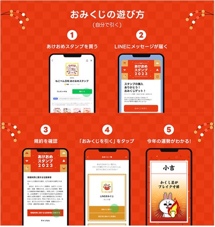 2023年1月3日(火)までの期間中に、対象の「あけおめスタンプ」を購入または友だちからもらうと、2023年の運勢が占える「おみくじ」を引くことができます。「おみくじ」は、2022年12月26日(月)から2023年1月3日(火)まで開封可能です。公式スタンプの大吉から凶までの「おみくじ」に描かれているイラストは、全て特別に描き下ろされたもので、「おみくじ」の結果ごとに様々なキャラクターの描き下ろしイラストを楽しんでいただけます。