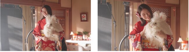 2023年は卯年ということで、アンゴラウサギの人形と共演をした朝日さん。朝日さんの演技に合わせて顔の向きを変えたり口を動かしたりと演技をするアンゴラウサギの人形に「本当に生きてるみたい!」と驚く朝日さん。細かく動きを再現するアンゴラウサギの人形に「めっちゃすごい(笑)」と、本物そっくりなアンゴラウサギの人形に興味津々。カットの間もアンゴラウサギを撫でて可愛がっていました。