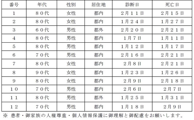 都内で新型コロナウイルスに感染した方が死亡されましたのでお知らせします。