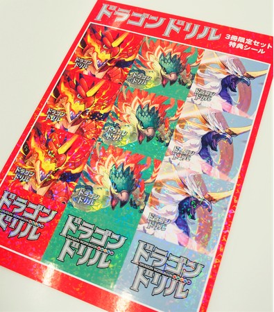 特典の1つめは、限定キラシールです。大迫力なドラゴンの表情と、カッコいいロゴを12枚収録。ノートや筆箱など、好きな場所・好きなものに貼って使えます。