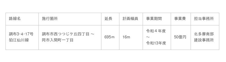 このうち、調布市西つつじケ丘四丁目から同市入間町一丁目までの延長695mの区間について事業に着手します。