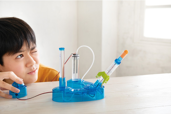 組立キットの水素エネルギーロケットは、電池を使わずに手回しで発電し、水からつくった水素を爆発させて飛ばすロケット。爆発は発射管の中だけでおきる安全設計なので、おうちの中で安心して飛ばせます。脱炭素社会実現のために注目されている次世代エネルギー“水素”をテーマとした、大人でもびっくりするような本格実験を楽しめます。