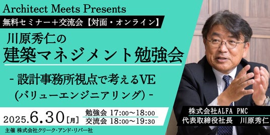 株式会社クリーク・アンド・リバー社(C&R社)が運営するクリエイティブやビジネスの共創と創発を生み出すFacebookコミュニティ『Architect Meets』は、6月30日(月)、建築業界で活躍する方々を対象に、セミナー「川原秀仁の建築マネジメント勉強会~設計事務所視点で考えるVE(バリューエンジニアリング)~」を開催します。なお、本セミナーは対面・オンラインのハイブリット開催を予定しており、対面開催では交流会も予定しています。