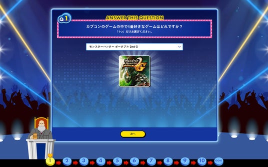 好きなタイトルやキャラクター、続編・新作を期待しているタイトルなど、カプコンファンなら答えてみたくなる10の質問をご用意。タイトルは約500タイトル、キャラクターは約1000キャラから選択できます。