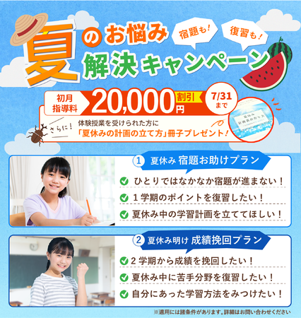 夏休みという貴重な時間を無駄にしてほしくないという想いを込めて、7月31日までに体験授業をご受講頂いた方限定で、夏に役立つ「夏休み 計画表の作り方冊子」をプレゼントいたします!!(ご入会されるかどうかに関わらずプレゼント!)是非、この機会にご検討ください!