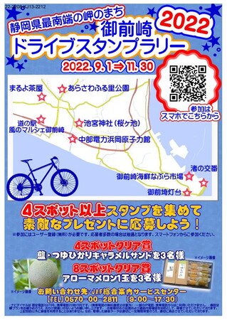 一般社団法人日本自動車連盟(JAF)静岡支部(支部長 太田勝之)は、9月1日(木)から、御前崎市観光協会(会長 川口正洋)が主催する「静岡県 最南端の岬のまち 御前崎ドライブスタンプラリー2022」の開催に協力します。