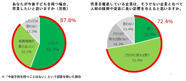 ・育業を推進する企業は、人材の採用や定着にプラスに作用すると考える人は、72.4%に上り、育業しやすい環境整備が人材確保にも影響する可能性を示唆しています。