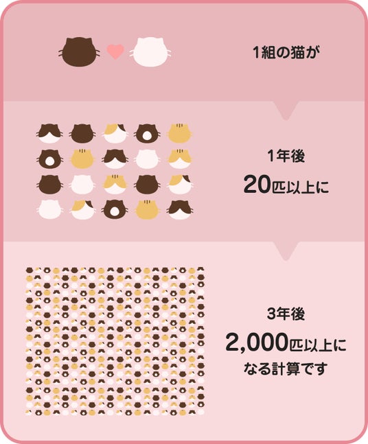 現在(※)日本では、年間約7,000匹近い猫がさつ処分されています。その大半は、捨てられた猫などが外で繁殖してしまい生まれた野良猫の子猫です。猫の繁殖能力は強く、年に2~3回、1回に4~8匹も出産をし、理論的には1組の猫のカップルから、3年後には2,000匹以上にもなるという試算もあります。不幸なさつ処分を減らすためには、野良猫に不妊去勢手術を施し、悲しい運命をたどる命を増やさないことが、最も大切です。