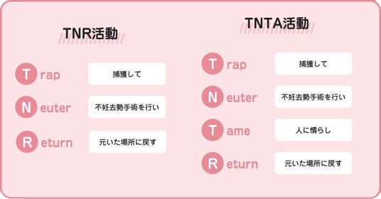 野良猫を捕獲して、不妊去勢手術をすることを、Trap(捕獲して)、Neuter(不妊去勢手術を行い)、Return(元いた場所に戻す)の頭文字をとって、「TNR活動」と呼びます。さらに、去勢後は、Tame(人に慣らして)、Adopt(譲渡する)というところまでを支援する「TNTA」という活動も近年広がっており、こちらの活動も猫部は支援しています。