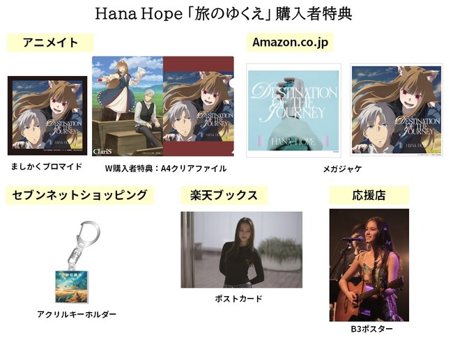 各ストアでの特典も決定しており、アニメイトではましかくブロマイド、Amazon.co.jpではメガジャケ、セブンネットショッピングではアクリルキーホルダー、楽天ブックスではポストカード、応援店ではB3ポスターがシングル購入者を対象に先着でプレゼントされる。さらに、アニメイトではHana Hope「旅のゆくえ」の期間生産限定盤と、ClariS「アンダンテ」の期間生産限定盤の両方を購入(予約引き取り含む)者に、両面アニメ絵柄A4クリアファイルが先着でプレゼントされる主題歌のW購入者特典も決定している。