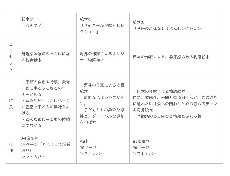 どれか1冊ではなく、毎月この3冊に親しむことで、4~5歳の身近な体験のきっかけと、グローバルな感性をみがく、社会への関わりと心の育ちがバランスよく成長します。