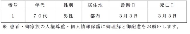 都内で新型コロナウイルスに感染した方が死亡されましたのでお知らせします。
