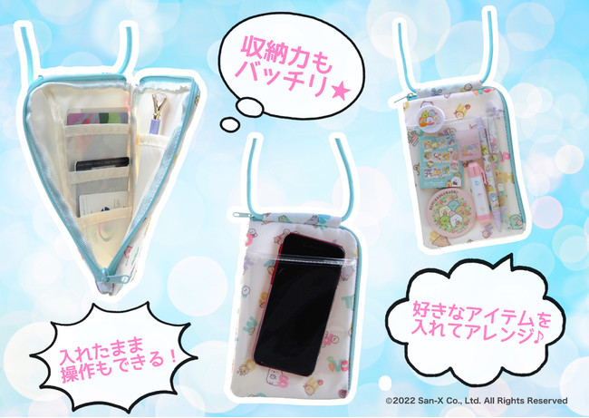 中のポケットにはカードやケアグッズなどを、外のクリアポケットにはスマホや好きなキャラクターグッズなどを入れて、あなただけのアレンジをしてみてね。