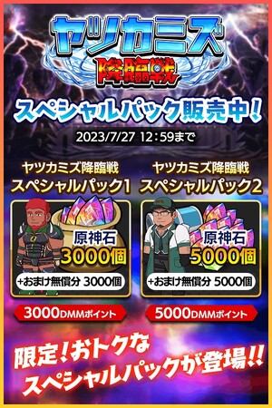 期間中、原神石がおトクに購入できる「ヤツカミズ降臨戦スペシャルパック」が2種登場。
