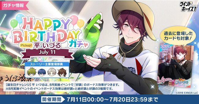 期間限定誕生日ガチャ「Happy Birthday 平 いづる ガチャ」では、「平 いづる(CV:北村諒)」の誕生日限定SSRカードが登場します。限定SSRカードは、Lvを上げることで「限定カードストーリー」をお楽しみいただけます。特別な誕生日イラストとカードストーリーを、この機会にぜひお楽しみください。