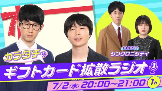オタク芸人たちが「ギフトカード・ギフトコード」の魅力を全力で語る特別番組「カラタチのギフトカード拡散ラジオ」を7月2日(水)20:00~21:00にstand.fmとYouTube(FANYStudioチャンネル)で同時生配信します。