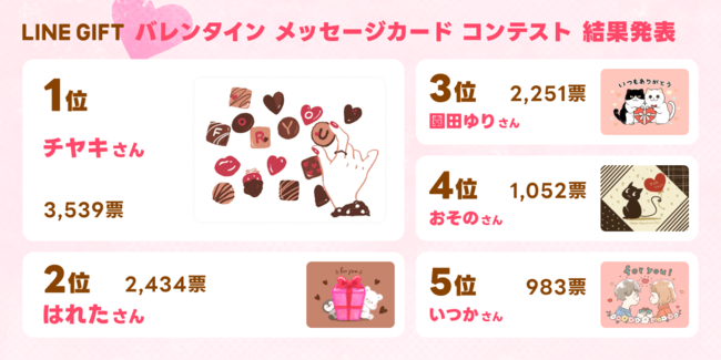 ■「バレンタインメッセージカードコンテスト」でユーザーからの人気を集めた上位5作品が本日より利用可能に!バレンタインにぴったりなデザインが勢揃い!