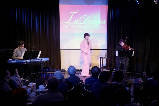 自身のヒット曲から第9弾シングル「哀愁港」、デビュー・シングル「女…ひとり旅」、昭和の懐かしい名曲カバーから神楽坂はん子の「ゲイシャ・ワルツ」、美空ひばりの「明治一代女」などを歌った後、ピアノとバイオリンの演奏者が加わって、ギターの弾き語りで中島みゆきの「糸」、井上陽水の「夢の中へ」、そして恩師の作曲家・鈴木淳さんのヒット曲で、ちあきなおみのデビュー曲「雨に濡れた慕情」を披露。