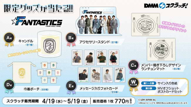 合同会社DMM.com(本社:東京都港区、会長 兼 CEO亀山敬司、https://dmm-corp.com/ 以下DMM )は、ハズレなしのオンラインくじサービス「DMMスクラッチ」にて、2023年4月19日(水)よりNew Single「PANORAMA JET」のリリースを記念して、「FANTASTICS スクラッチ」を販売することをお知らせいたします。本くじでは、DMMスクラッチ限定の多彩なラインナップと共に、メンバーのサイン入り色紙などが抽選で当たるWチャンス賞を計31日間開催いたします。