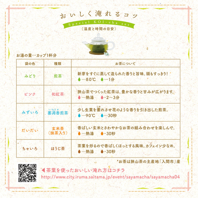 『恋茶』と、作品の舞台・埼玉県入間市がスペシャルコラボ! 狭山茶誕生の地であり主産地の入間市の、80を超えるお茶屋さんが集う入間市茶業協会で「限定☆恋茶セット」をつくりました。狭山茶のおいしさと楽しさを味わえる、贅沢なティーバッグセットです。