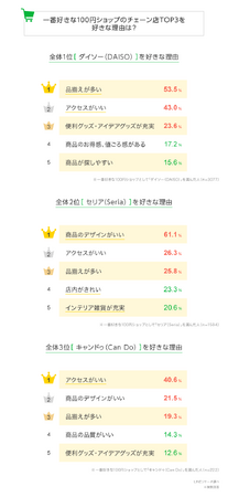 一番好きと回答した100円ショップのチェーン店について、それぞれ好きな理由を聞きました。