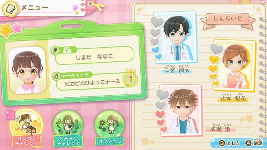 本作には、ストーリー展開を楽しむだけではなく、ナースとして目指すべきさまざまなミッションをこなす「チャレンジ」や、各オシゴトゲームでのハイスコアを更新するなど、やりこみができる要素が豊富に用意されています。特に、ファッションアイテムやナース服を手に入れるミッションは、繰り返し挑戦してクリアする難易度の高いものもあるため、遊びごたえがあり、長くお楽しみ頂けることと思います。