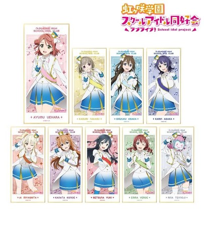 上原歩夢、中須かすみ、桜坂しずく、朝香果林、宮下 愛、近江彼方、優木せつ菜、エマ・ヴェルデ、天王寺璃奈をスタンド付きの色紙に仕上げました。