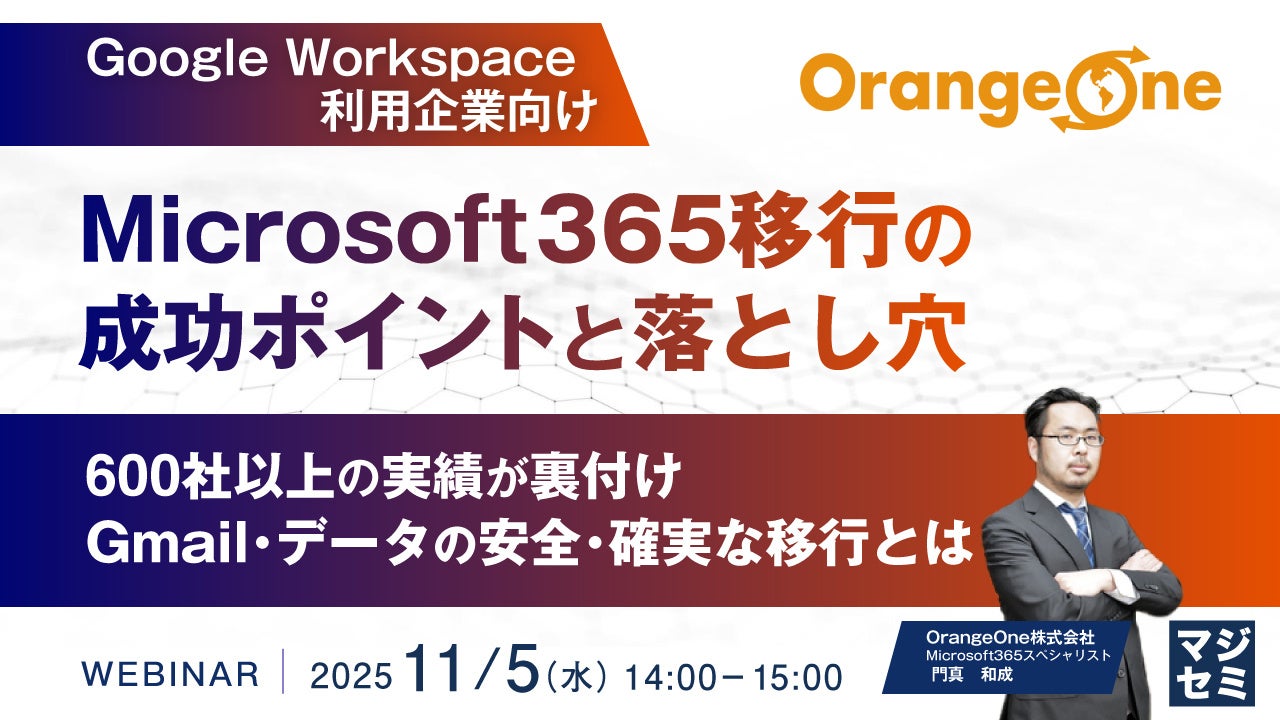 本セミナーでは、600社以上の導入サポート実績と15年以上のMicrosoft 365導入経験をもつOrangeOneが、失敗しない移行の具体策を解説します。数ある移行ツールの中からお客様の環境に合った移行ツールを選定し、段階的な計画立案、管理者向けトレーニングを組み合わせ、技術的な課題や業務影響を最小化するアプローチを紹介。さらに、最適なテンプレートや詳細マニュアル、構成・運用・移行の複雑性や個別要望に応じた柔軟な対応、豊富なナレッジに基づく導入後サポートプランを提供し、安心して任せられる体制を整えています。加えて、Office製品とライセンス統合によるコスト削減や、Microsoft 365上位ライセンスでの包括的なセキュリティ実装事例も取り上げ、移行を検討する企業に「確実な道筋」を示します。