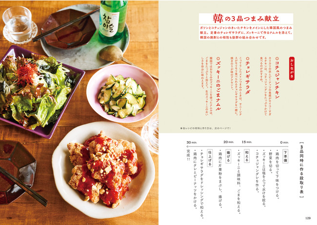 さらにPart3では、「ゆっくり呑みたい日の3品つまみ献立」と題し、週末など、ちょっと時間がある日に楽しみながら作りたいおつまみレシピを、3品の献立形式でご紹介しています。和風、洋風、中華風、韓国風、エスニック風のテーマ別なので、その日の気分に合わせて選べます。また、3品同時に効率よく作れる段取り表付きなので、何なら呑みながらでも作れちゃいます!